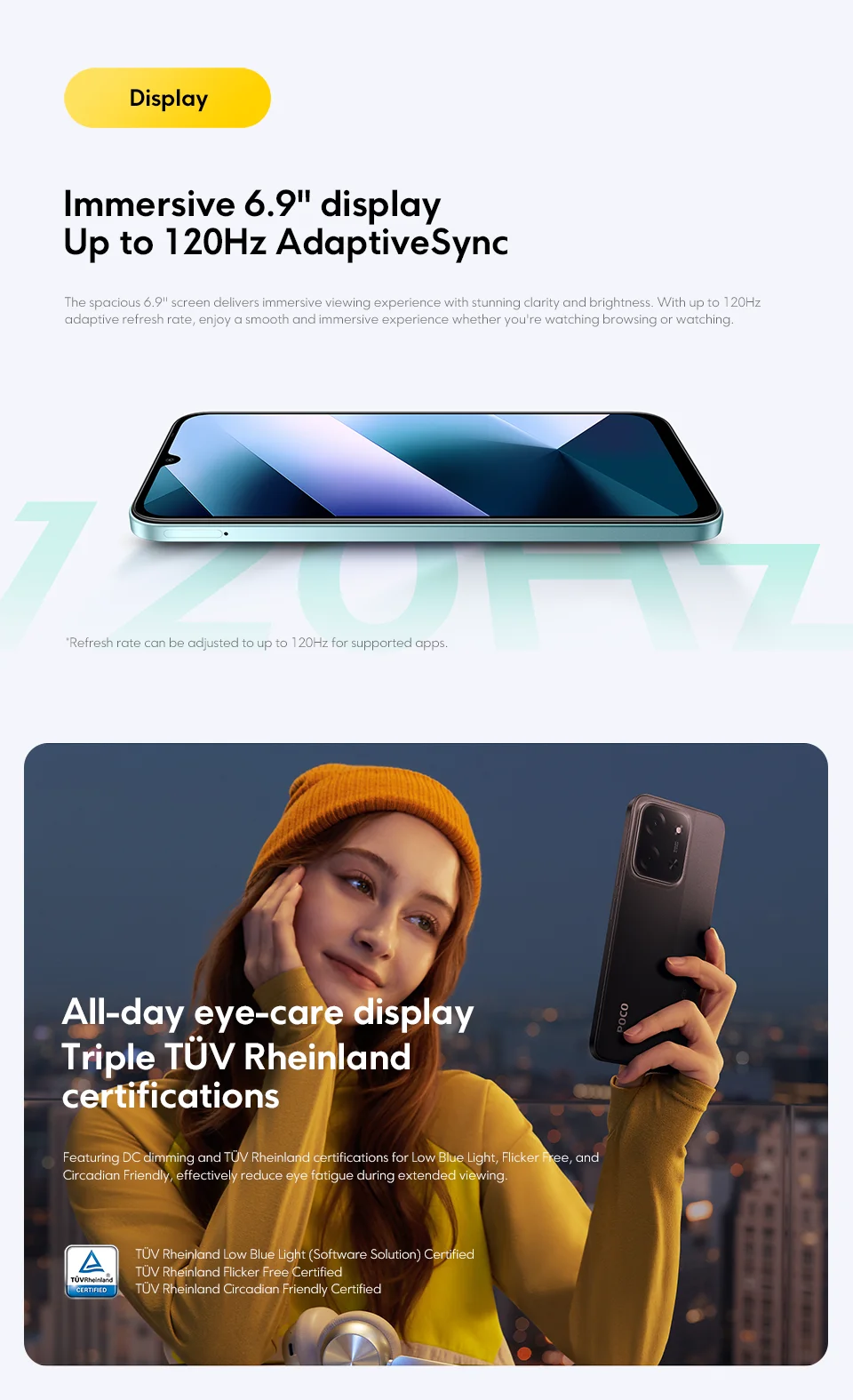 Screen -------- 6.9" Dot Drop display• Refresh rate: Up to 120Hz• Resolution:1600*720